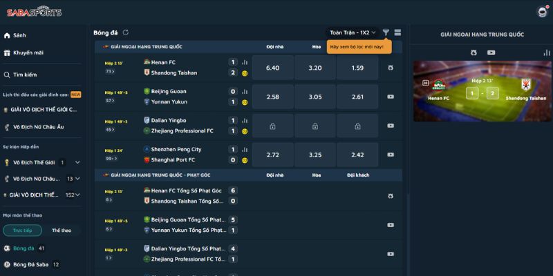 Bóng đá luôn là tâm điểm tại Saba Thể Thao, với hàng ngàn trận đấu từ các giải đấu danh giá như Premier League, La Liga, Serie A đến các giải đấu nhỏ hơn như V-League hay AFC Cup. Anh em có thể đặt cược vào mọi chi tiết, từ kèo châu Á, kèo tài xỉu đến cược số quả phạt góc.